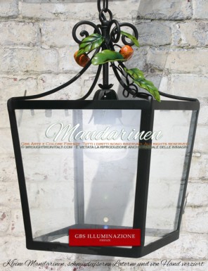 Lantern with Wisteria Hand-decorated wrought iron. In picture: Hanging version, lantern and forged scrolls in anthracite black enamel. Flowers and