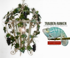 Laterne aus Schmiedeeisen mit Trauben und Weinreben. Weiße und rote Trauben, Gestell der Laterne antikweiß, als Hängeleuchte und mit Arm