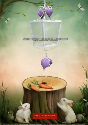 Children’s bedroom light purple amethyst, wrought iron lantern with heart pendants in antiqued and aged tempera. Square lantern, forged spirals,